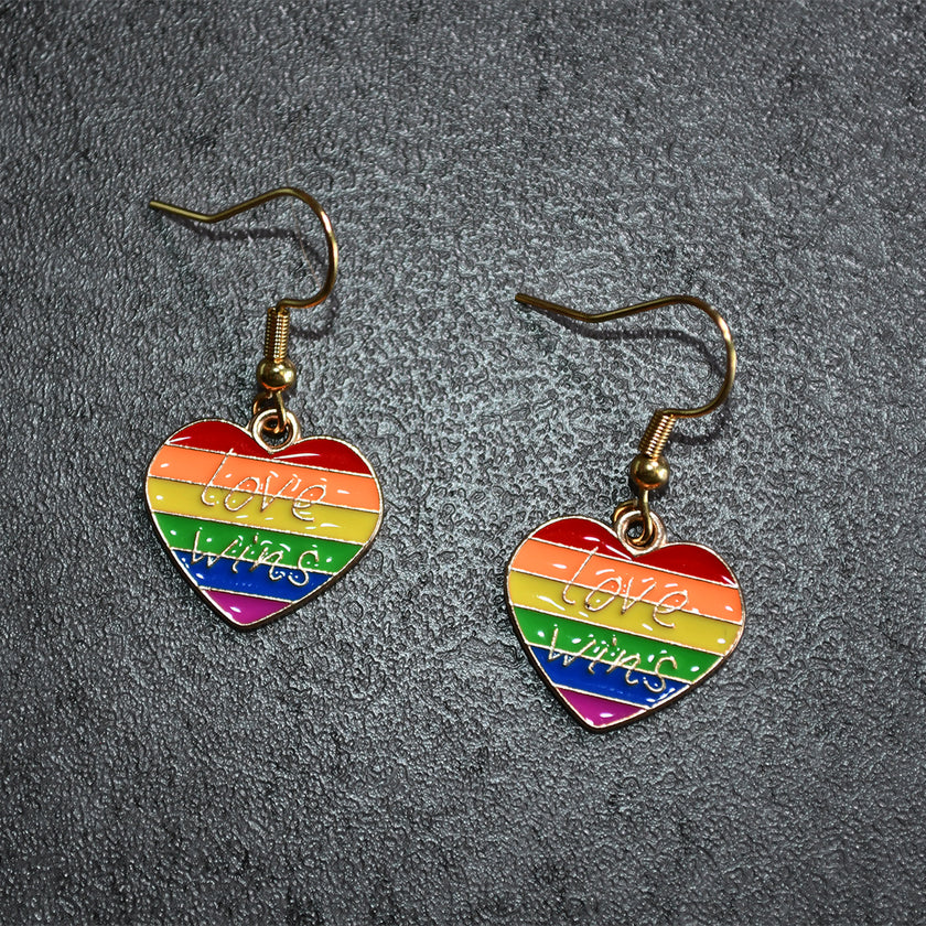 Celebrate Love - Pride Earrings feature vibrant rainbow hearts that boldly proclaim 'Love Wins,' offering a powerful and colorful accessory celebrating love and equality.